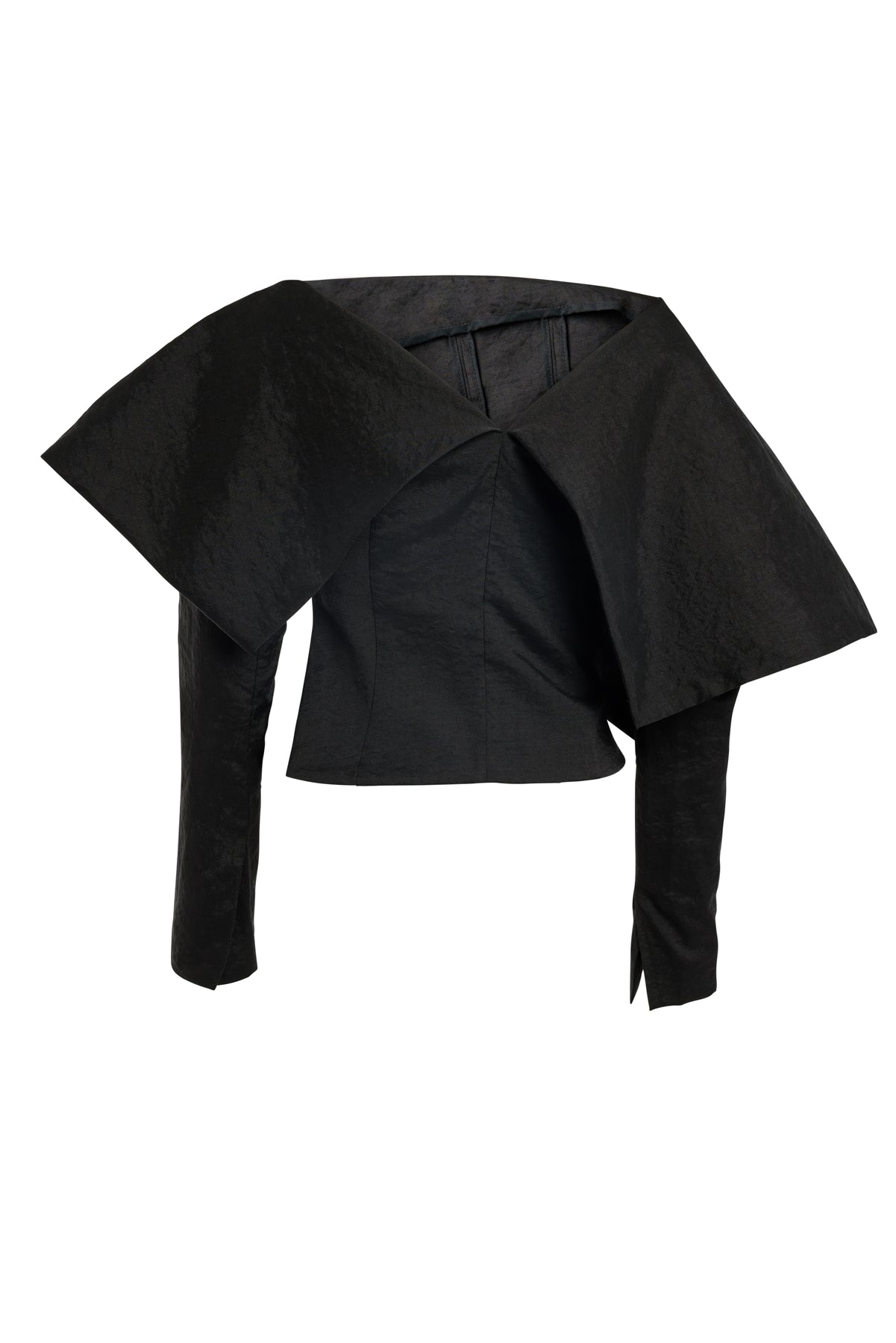 Cut in a fitted silhouette, this cropped top features long sleeves with open cuff detailing and a distinctive oversized asymmetric collar. One shoulder sits slightly open, enhancing the sculptural neckline and introducing a subtle directional edge to the close-to-body form.