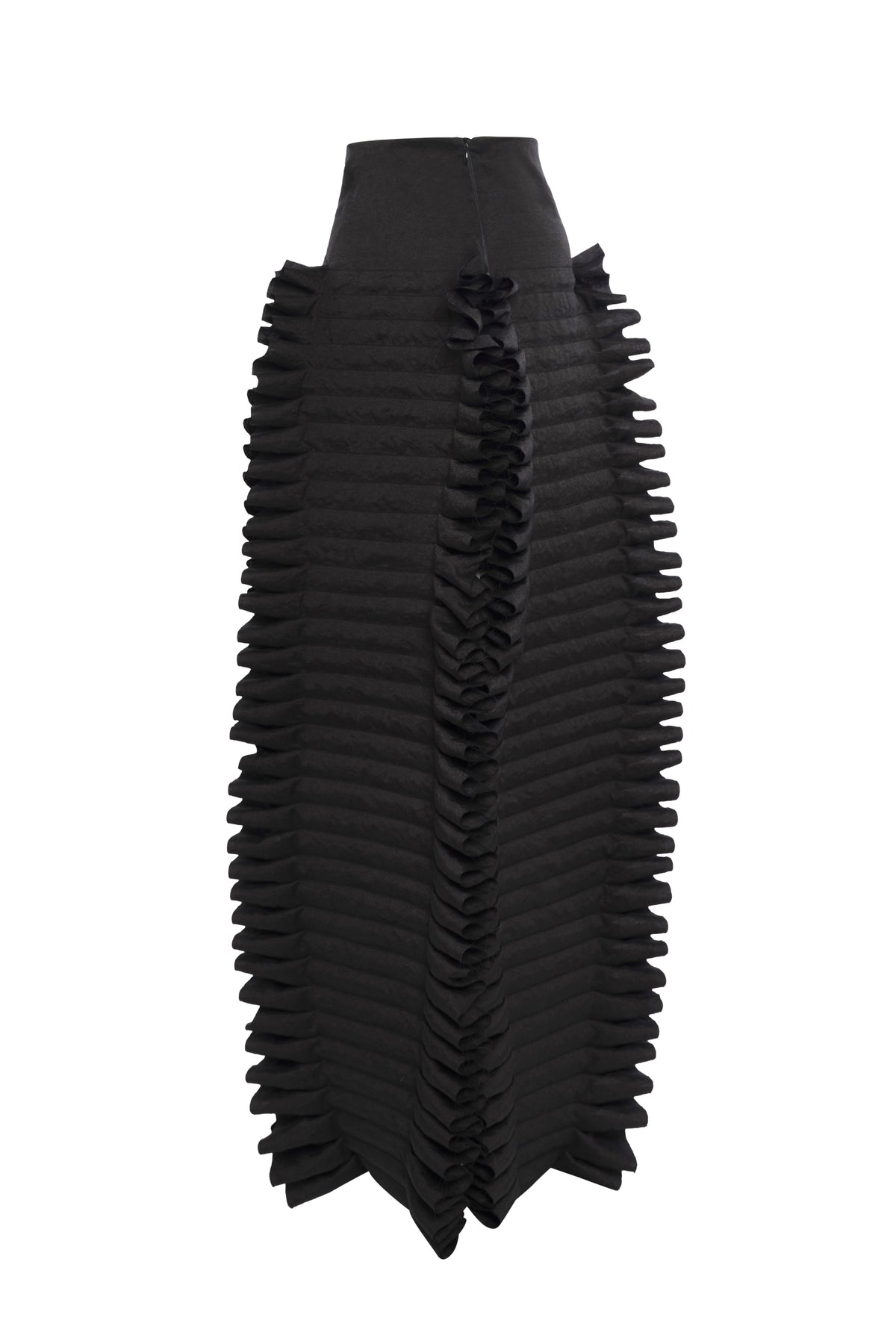 Designed with a defined high waist, this maxi skirt is assembled from four individual ruffled panels that generate a sculptural, wave-like pleated effect through the length. A high front slit breaks the structure with a sharp opening, adding fluid movement to the voluminous silhouette.