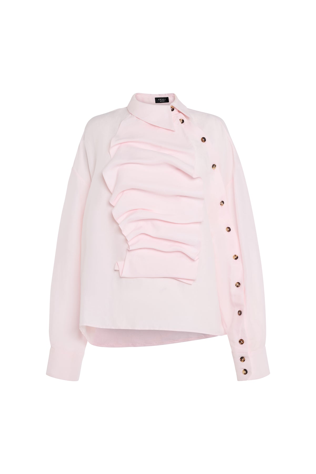 Defined by a collar set to the side, this top is structured with horizontal bib-front pleats and sculptural folds through the torso. Long, voluminous sleeves are refined with buttoned cuffs, while an asymmetric shoulder placket introduces a precise, directional finish.
