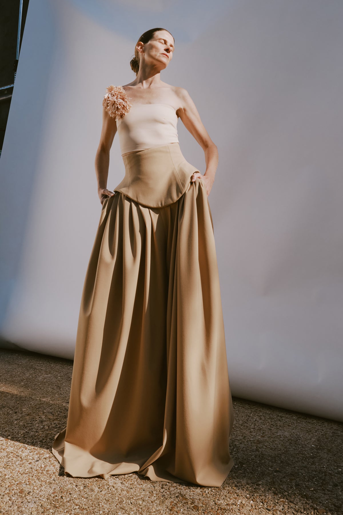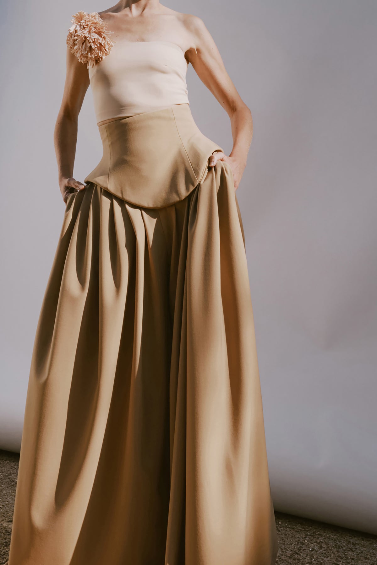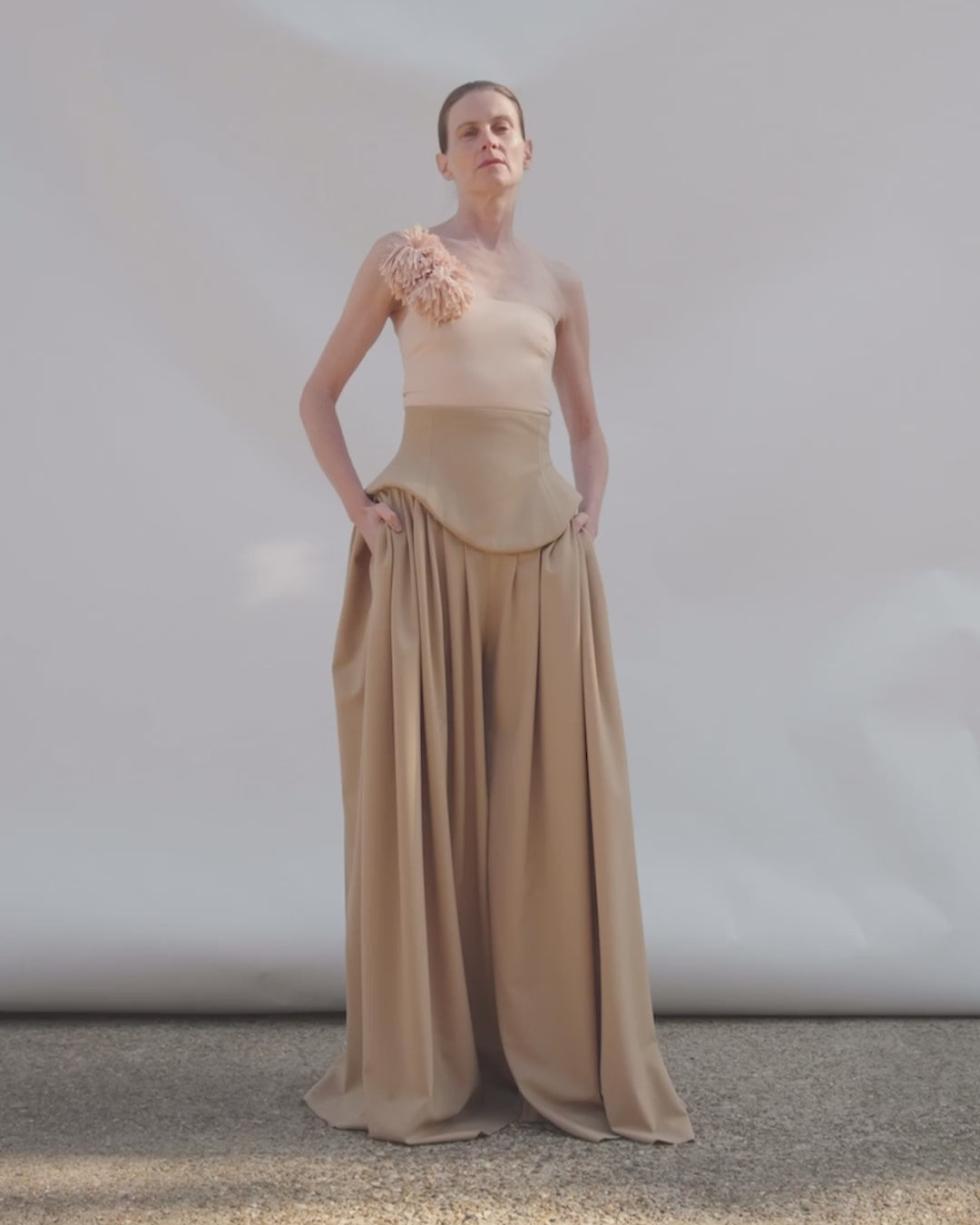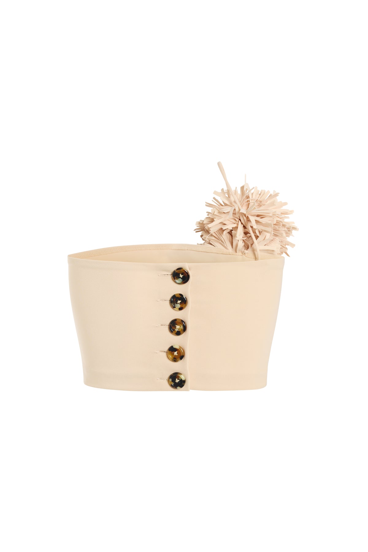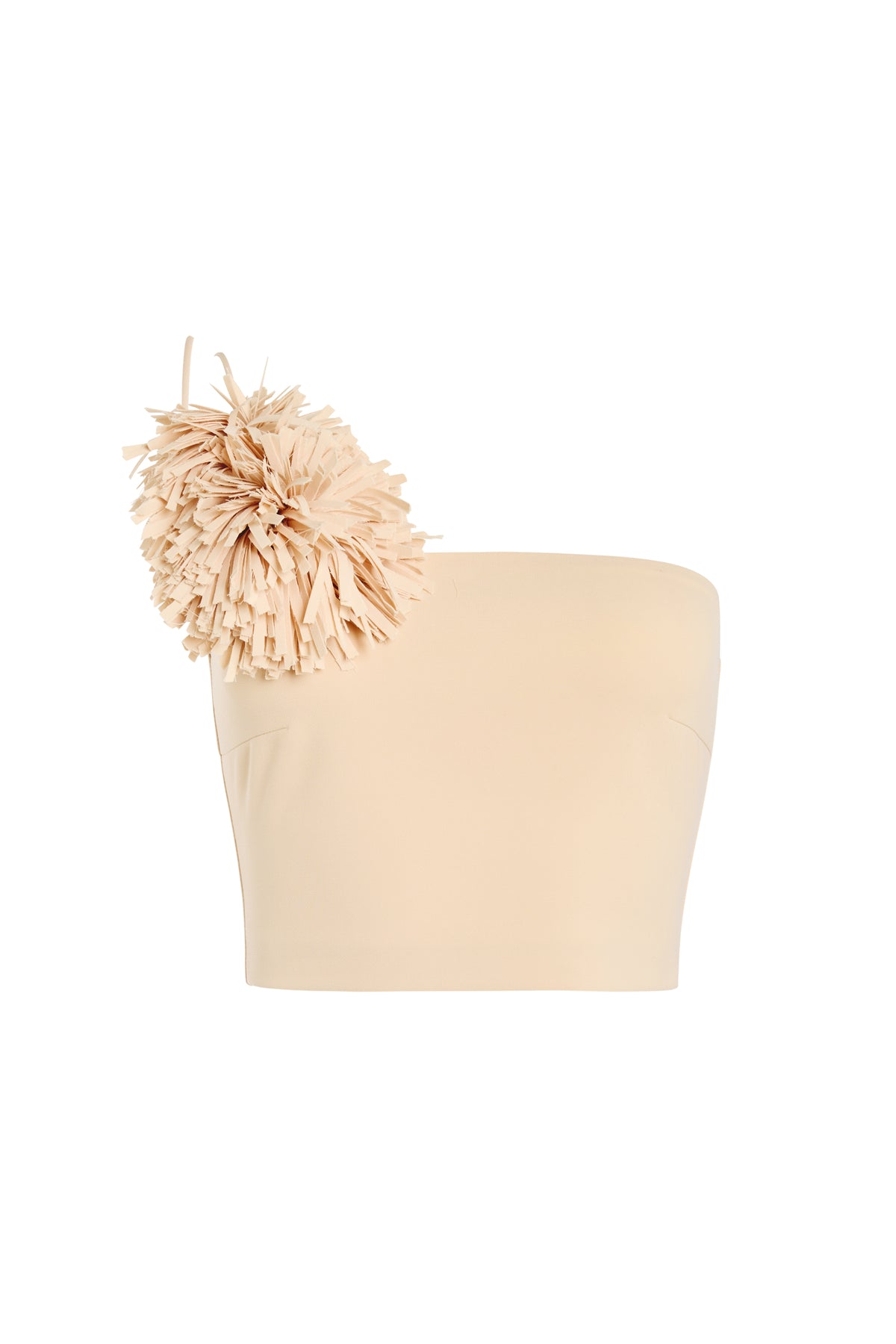 Cut in a fitted bustier silhouette, this top is defined by a single shoulder strap detailed with two sculptural fabric pom-poms for asymmetrical emphasis. Contrast buttons at the back introduce a sharp, graphic note against the clean, close-fitting shape.
