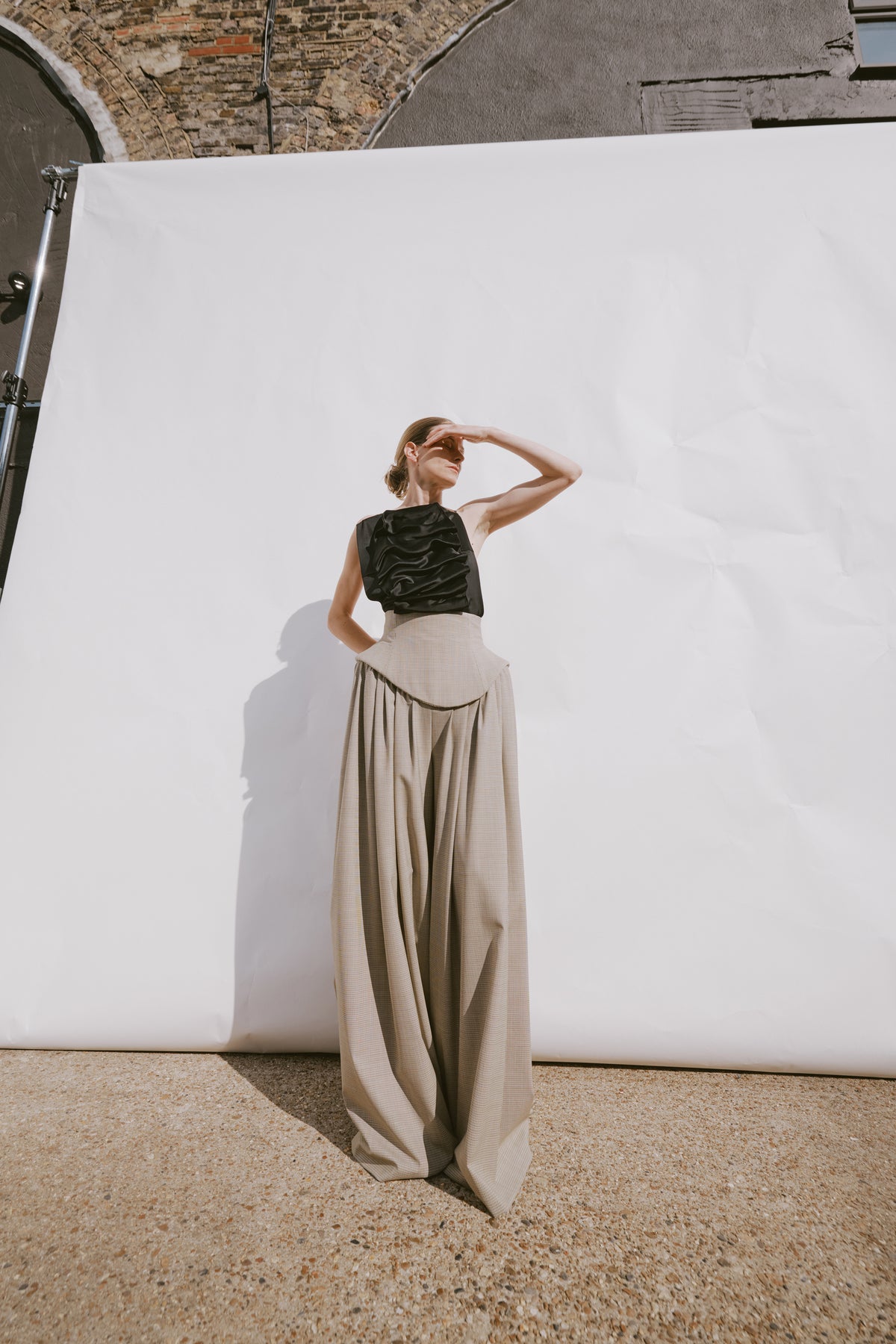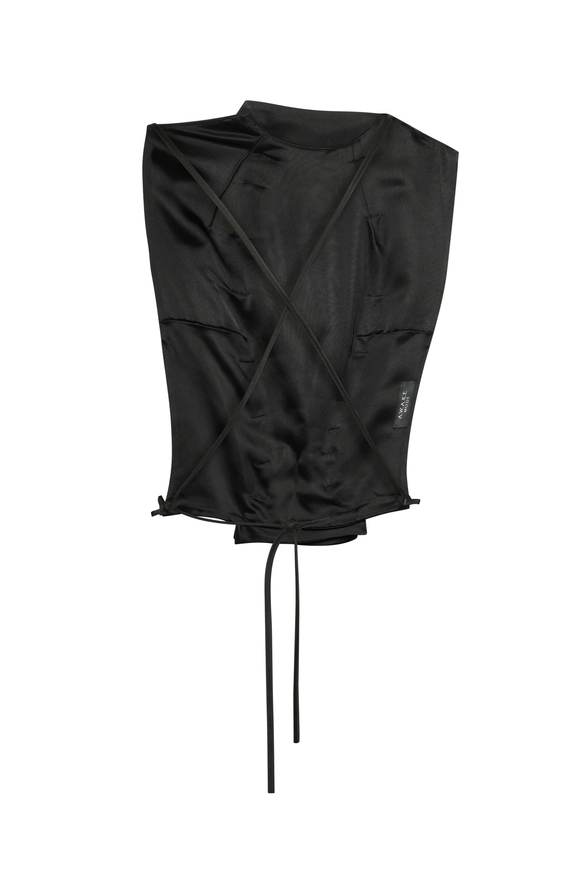 Crafted from soft viscose, this top is tailored in a fitted silhouette with a square-cut front. A bib-front panel defines the upper structure, while the back opens and is refined with adjustable drawstrings for a precise fit.