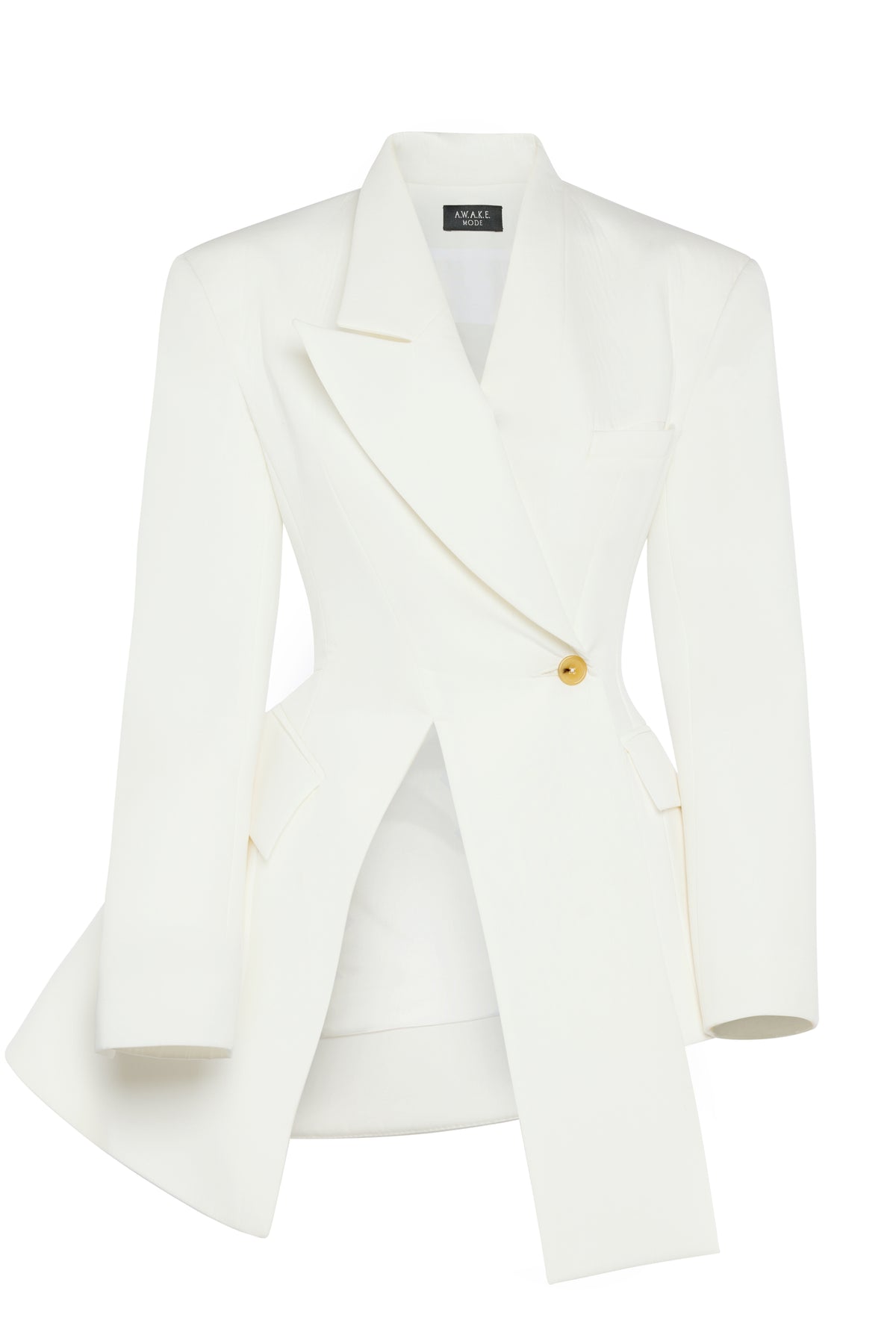 Crafted from bonded poly cotton, this blazer is shaped with exaggerated sharp shoulders, a defined fitted waist and a rounded asymmetric hem. The single-breasted closure draws the eye downward to an uneven front hem and elongated longline profile, reinforcing its directional cut.