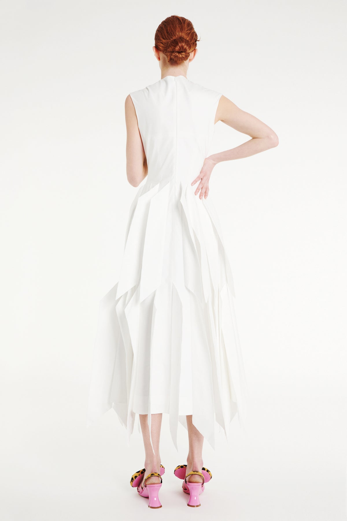 Cut to a midi length, this sleeveless dress is crafted from a structured cotton blend with subtle stretch. A round neckline defines the upper body, while the skirt falls into an A-line silhouette. Raw-edged 3D panels along the hem add dimension and a restrained architectural detail.